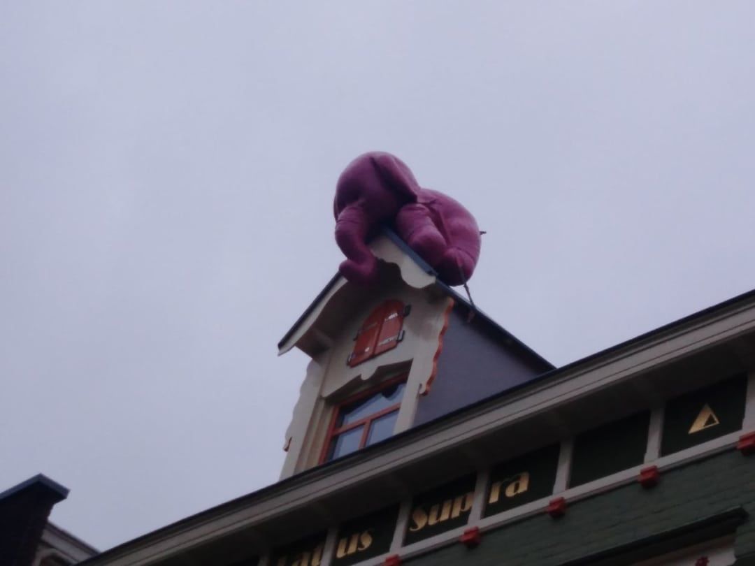 Foto : Olifant op het dak in de Overstraat en de winkel. FOTO Alex Schokker. ( vermelden).