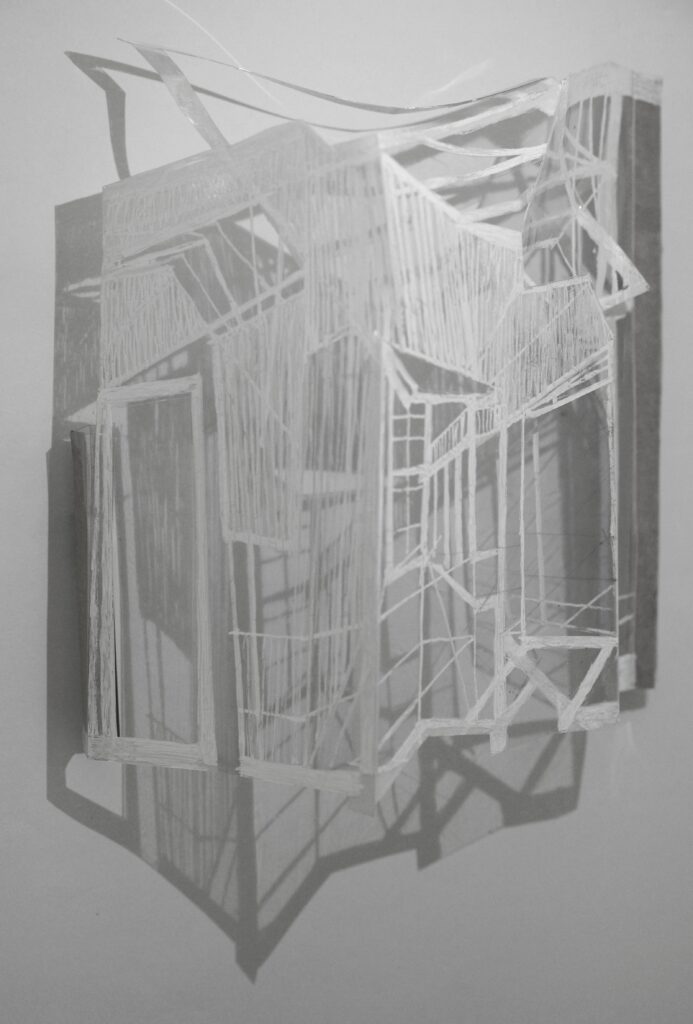 Kim Habers experimenteert tijdens de tentoonstellingsperiode voor het eerst met digitale tekeningen. Via een tijdrovend proces met lagen acryl verwijdert de kunstenaar na het printen de papieren onderlaag. Met de half transparante tekeningen die overblijven bouwt ze ruimtelijke werken waarin licht een grote rol speelt.