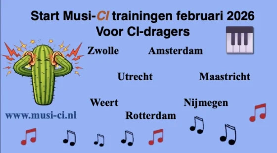 Voor sommige CI-dragers klinkt muziek stekelig als een cactus. Scherp, onvoorspelbaar, soms zelfs onaangenaam. Maar daar kun je wat aan doen. De Musi-CI training helpt dragers van een cochleair implantaat (CI) om opnieuw plezier te beleven aan muziek. In kleine groepen en met speelse oefeningen leer je je gehoor opnieuw afstemmen op klank, ritme en melodie. De gehoortraining geeft je handvatten om zelf actief met muziek aan de slag te gaan. Je ontdekt nieuwe muziek, herontdekt oude favorieten en leert hoe je muziekbeleving kunt verruimen. Muziek zal misschien nooit meer helemaal klinken zoals vroeger, maar wél minder stekelig – en steeds aangenamer.