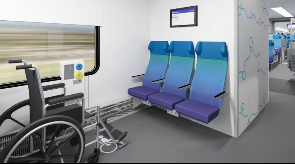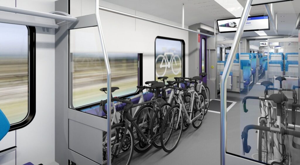Elke nieuwe vierdelige trein biedt 248 zitplaatsen, waaronder 12 in de eerste klas, en heeft een totale capaciteit van 457 reizigers. Reizigers profiteren van ruime interieurs en multifunctionele zones die kunnen worden aangepast aan seizoensgebonden behoeften, met flexibiliteit tussen fietsplaatsen en extra zitplaatsen. Stiltezones bieden een rustige omgeving voor wie wil werken of ontspannen, terwijl speciale ruimtes voor rolstoelen en fietsen zorgen voor volledige toegankelijkheid. De treinen zijn verder uitgerust met moderne, PRM-conforme toiletten, stopcontacten, realtime reisinformatie en duidelijke bewegwijzering.